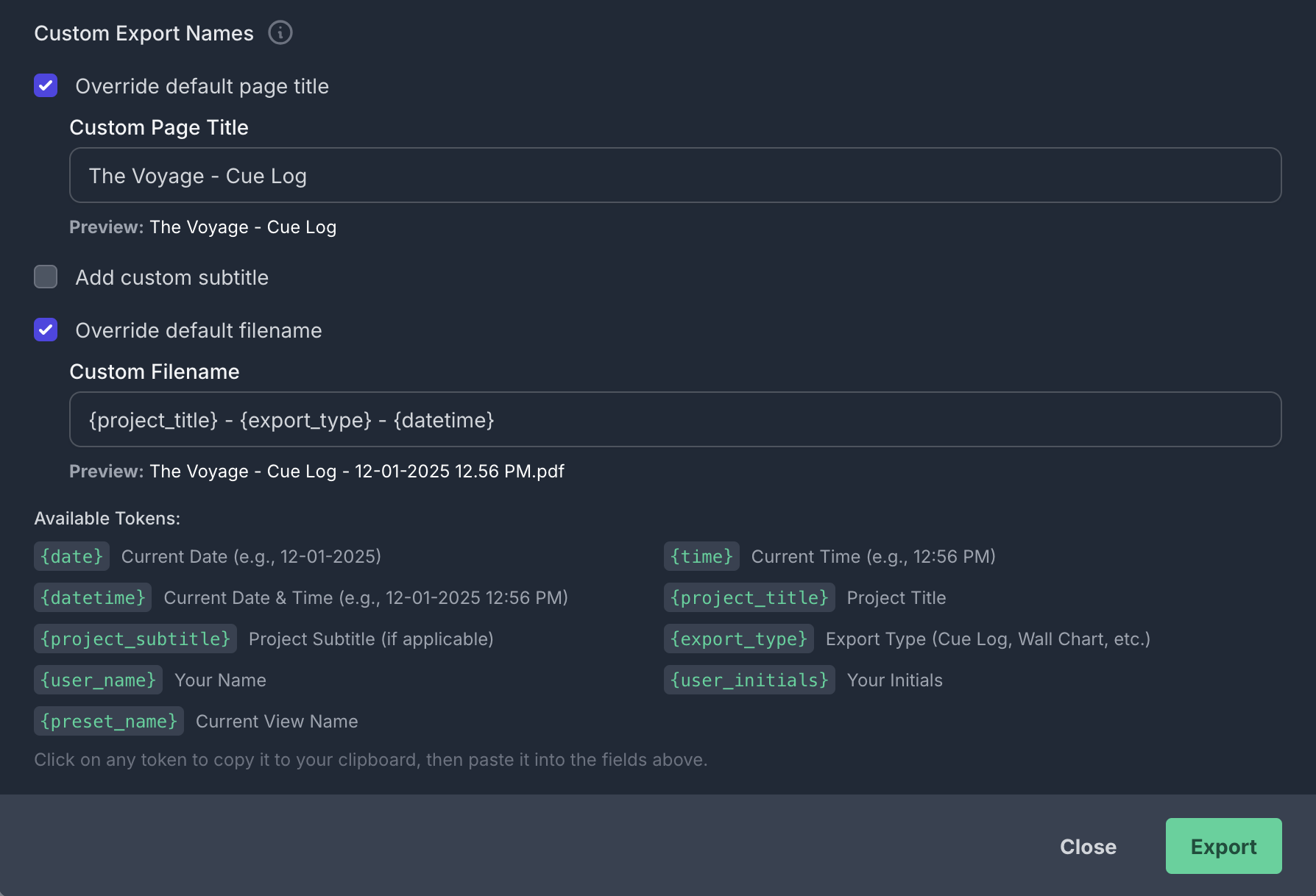 - Redesigned exports: Enhanced exports for cue logs, wall charts, version notes, recording orders and take notes.